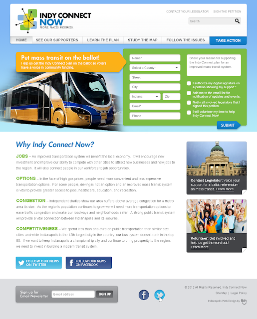 We worked on this project in a very quick time frame of less than one month from start to finish. As we learned about the initiative and relationship to Indy Connect and CIRTA organization, we designed a logo to represent the initiative and created a custom web design that pulled from the elements of CIRTA with a unique twist. The focus of the website is to gain signatures on the petition for mass transit, so we placed the petition in a prominent position on the home page. The website is connected to our Content Management System for easy maintenance, and our solution included a custom application with reporting on the petition signatures.