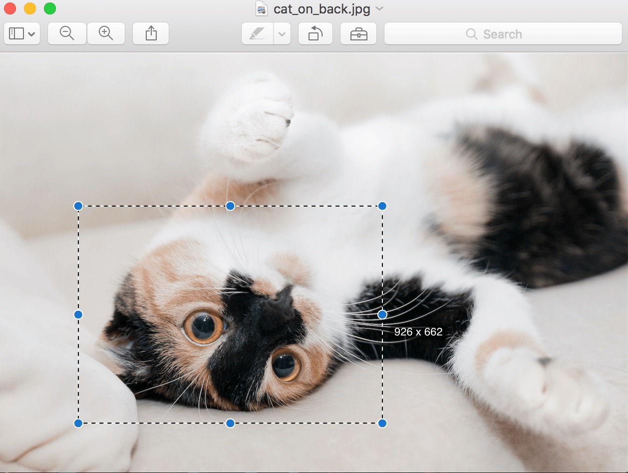 But, you can do more than just crop a photo down. You can make specific selections and copy/paste those selections in the same or in different photos within Mac Preview. Want this cat to have three eyes? Just use the Smart Lasso tool to select one eye, then copy/paste/move it it into place.