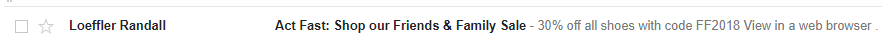 Including action-oriented verbs in the subject line prepares recipients to take action. In the example below, Loeffler Randall created a sense of urgency with use of an action verb.