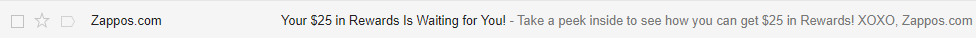 Optimize your email preview.The email preview isn’t technically the subject line. But used well, it can bolster your subject line. It’s the snippet that comes after the subject line in many email clients, and it can be used to provide more information and give the user even more incentive to click, like this example from an email sent by Zappos.