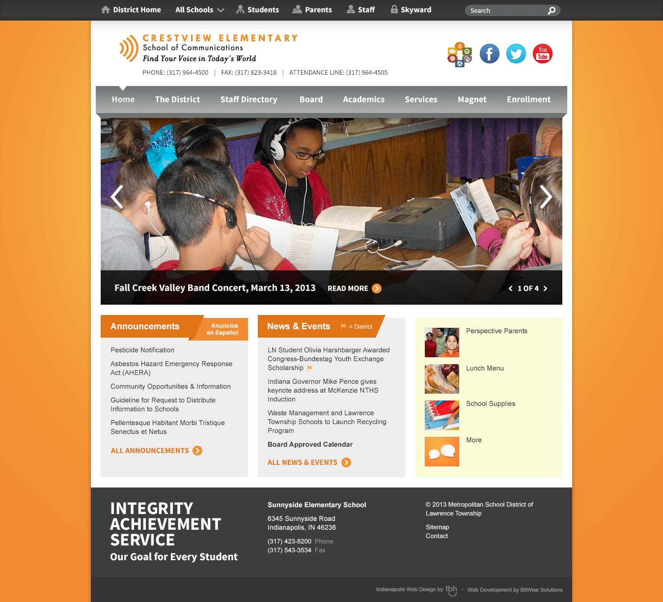 MSD of Lawrence Township called on BitWise Solutions to develop a website platform for all of their schools and the main district website. BitWise recognized the design challenge inherent to this project and called on TBH Creative to create a design that was attractive, flexible, and functional. These two Indianapolis website development firms have worked together before when they come across projects that best fit each other’s strengths. Together they worked with MSD Lawrence Township to develop a website solution that met each school’s needs while also best representing the district as a whole.Bjorn Carlson, Business Development Manager at BitWise notes, “The MSD of Lawrence Township project was a unique collaboration between the school district, the technical and functional expertise of BitWise Solutions, and the user experience and web design capabilities of TBH Creative. While these scenarios can often present distinct challenges, the partnership between BitWise and TBH Creative to deliver an outstanding product for the school district of Lawrence Township proved to be very fruitful. With an extremely well-received and successful end result, Tatum and her crew really demonstrated why TBH Creative is a thought leader in the web design space.”