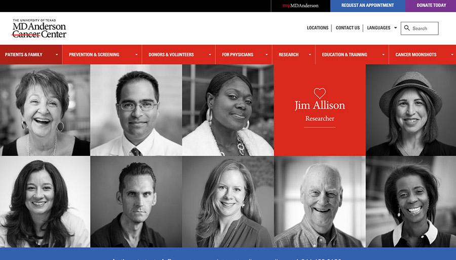 Imagery plays a huge part in the overall feeling your website conveys. One of the best ways to connect with your audience is to show real images of your doctors, staff, and facilities instead of relying on stock photography. Stock photos can come across as impersonal or cheesey, whereas using real photos can help put patients at ease and add a valuable humanizing touch to your website. Make sure any photos used are high-quality images in order to keep a professional appearance across your pages.The MD Anderson Cancer Center homepage prominently features photos and stories of real staff and patients to connect with its audience.