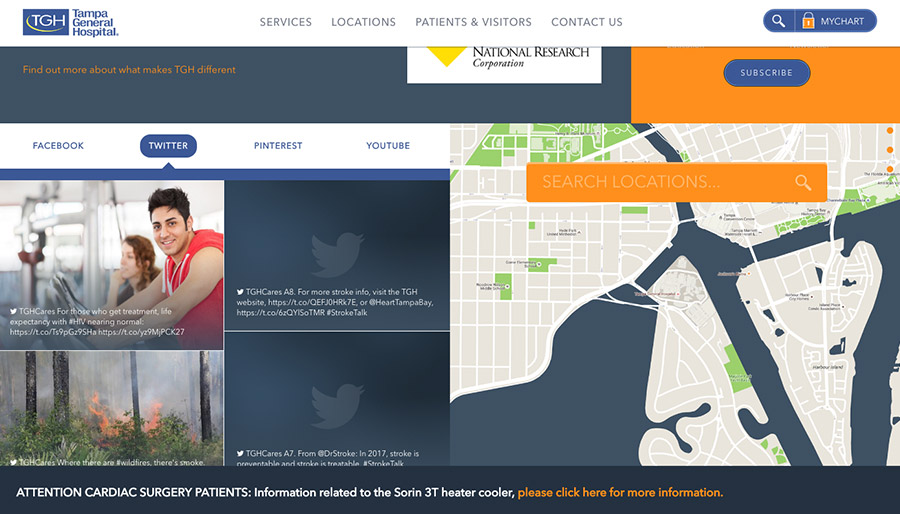 You don’t want to simply focus on getting users to your website, but also on further engaging those users. One way to do that is by incorporate social media into your overall website strategy. Utilize functionality like social sharing and social feeds to add interactivity and dynamic content to your website. Social media integration helps to engage your community and increase trust in your brand.The Tampa General Hospital website homepage features social feeds from its various social accounts to engage users.