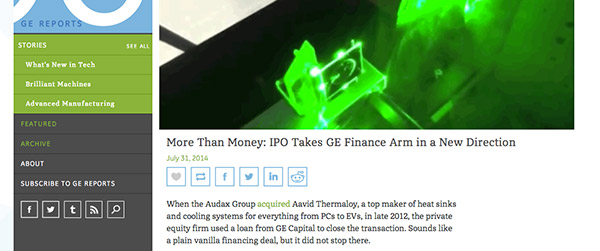 The GE Reports blog has sharing icons prominently displayed on each post.