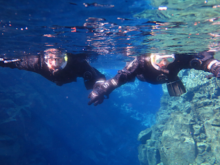 • Traveling: I’ve been to four continents and 21 countries, and visiting all seven continents is on my bucket list. (Pictured: My fiancé Nate and I snorkeling in Iceland.)