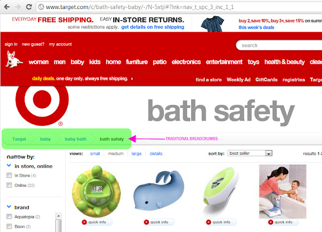 It is important to identify for the user where they are on a website and within which section. This is especially important for large websites so that users do not get lost. Breadcrumbs are a great option. They are most often used in a simple form, for example: Home > Products > Bath > Towels. This shows which section the user is in and how they got there.