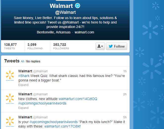2. Content based on current issues: The best example here is retail – in November you start seeing Christmas decorations. They are giving their audience reasons to interact based on timing. In your business that could be seasonal but it could also be related to something in the news. Keep your ear to the ground and interact based on what’s really happening. There is certainly something engaging about this type of content and you can expect some spreading of the word but this content takes the next step and connects with people. It gives them a reason to interact with you. This post is being written in August and Walmart is capitalizing on the back to school time of year (and also Shark Week on the Discover Channel just for fun):