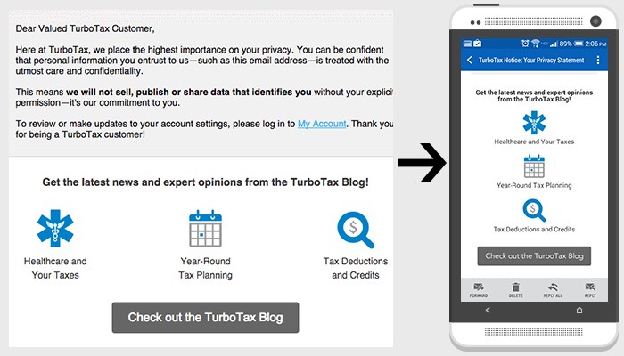 TurboTax links to important content with an icon and short headline, which fits within the entire screen on mobile.