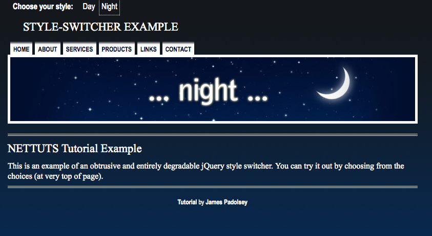 Style switcher allows the user to click on a button that changes the style of the page. This changes the css template based on which button the user chooses. Some designers do this with color palettes, others use it to change the whole theme of the page. This example is of a theme change between night and day.