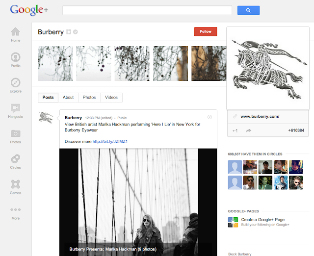 Burberry uses Google+ to display new products, fashion inspiration, and more. They have several photo albums and videos. By keeping their profile updated, their audience is engaged and has a reason to keep coming back.