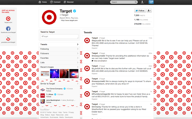 Target uses Twitter to advertise sales, talk to customers, and discuss new events. Twitter makes it easy to reply to customer complaints, suggestions, and compliments.