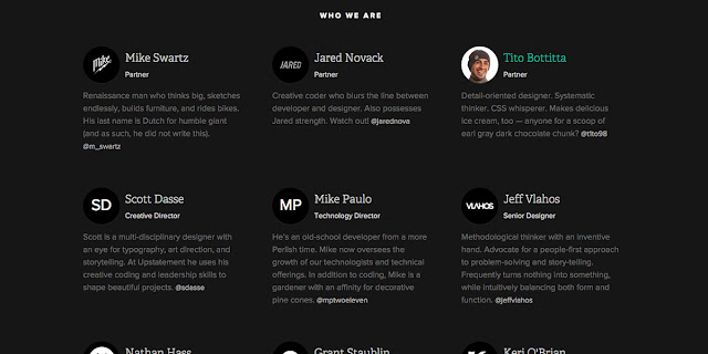 | The UpStatement team page not only includes photos of their team, but each staff member has their own custom logo, adding extra personality to the page |