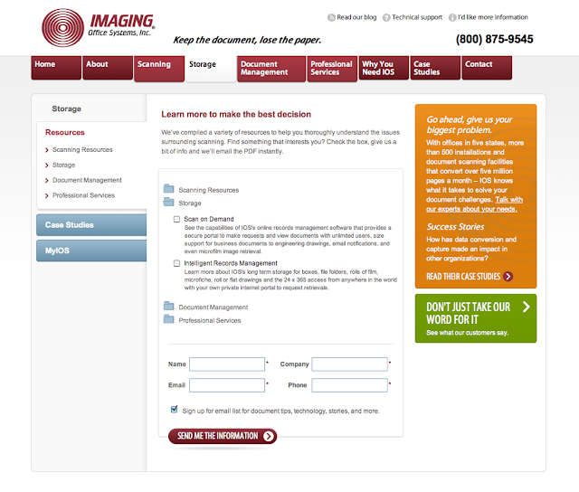 One primary goal of the new website was to communicate to visitors that they offered more services than typically thought of — more than just scanning and document management. They also offer custom professional services and storage. We emphasized this throughout the website and with a clear navigation structure and calls to action.