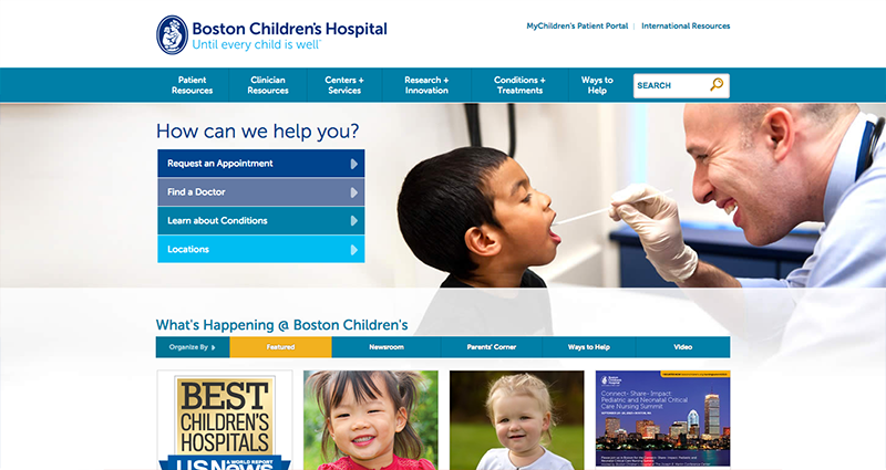 On the Boston Children’s Hospital homepage, it prominently displays important features like requesting an appointment or finding a doctor that can be quickly accessed in the banner area. It also promotes various interactive content, such as videos and news items, which help to engage users. The website has a lot of information, but it’s organized with a clear hierarchy in the navigation.