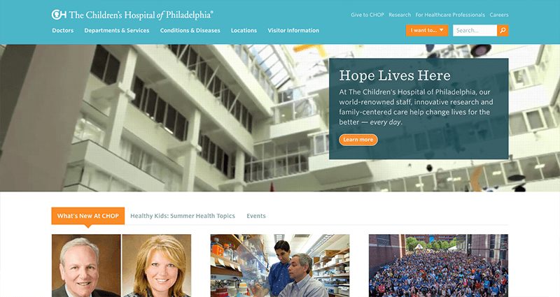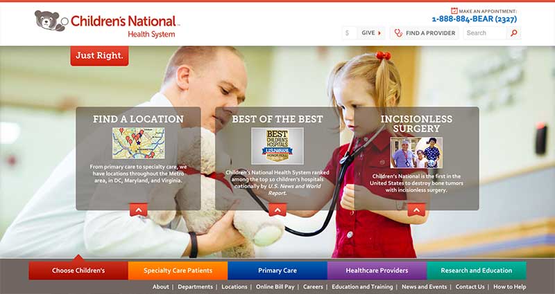 Children’s National Health System uses bright colors on its homepage, which aligns with the fact that it is a pediatrics website. It calls out it’s phone number in the header along with a “find a provider” quick link so that visitors can easily access this information. Also on the homepage is a search for conditions and treatments, which is a useful feature for visitors. The tabs at the bottom provide easy access points to the various sections of the website.