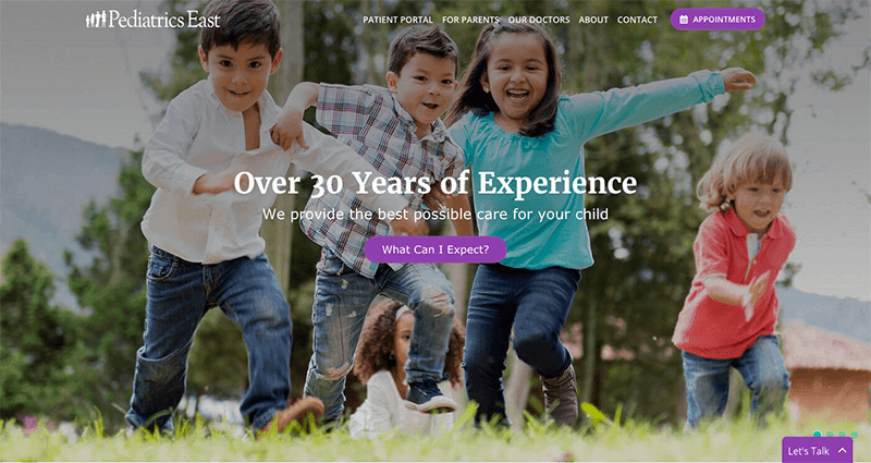 The Pediatrics East website has an effective homepage, with a large banner area highlighting important information and high-quality imagery. Appointment information is called out in the navigation to make it easy to find for visitors. Their good pediatric website also has various scroll and hover effects that make it feel more interactive.