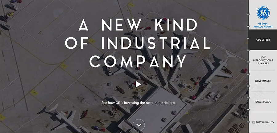 The GE report uses video front and center to engage it’s audience. The report is separated by sections, making it easy to navigate to specific information. It has an effective balance between content and imagery, and uses graphics to illustrate key information. The report also includes social sharing links throughout the content. View the report