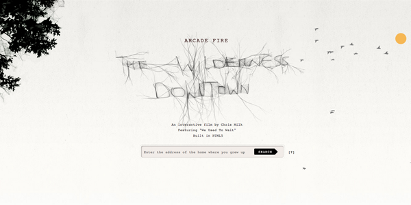 This is by far my favorite HTML5 website (as of right now). The Wilderness Downtown is an interactive website/music video for Arcade Fire’s song “We Used to Wait”. Users are asked to enter the address of childhood home. The site uses Google Maps and HTML5 to create a one of a kind personalized music video.