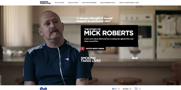 Smoking Takes Lives features a story of Mick Roberts (whose life was changed by smoking). This large photograph will help to grab the user and have them watch the video before accessing any other part of the website.