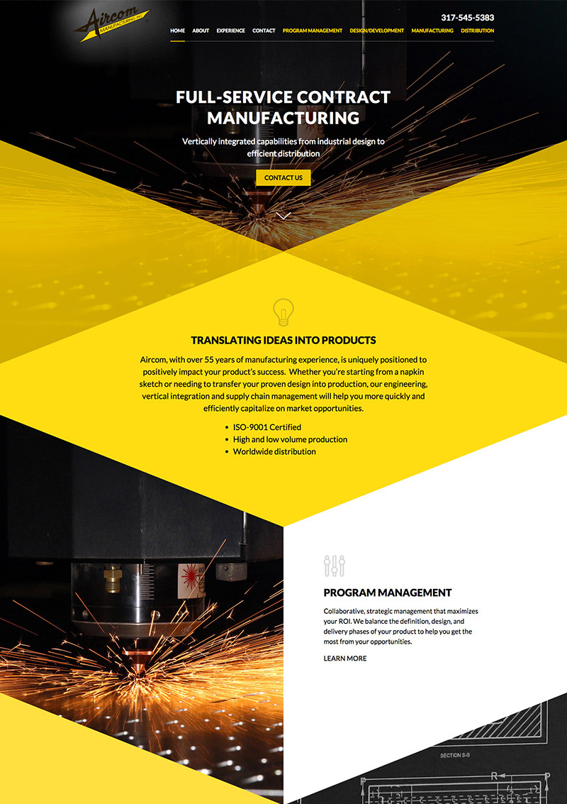 Emphasis on manufacturing process: Through both design and content, the new websites clearly illustrate that Aircom can work with companies through the entire manufacturing process from design to distribution.- The menu highlights the process in a different way than the other menu items.