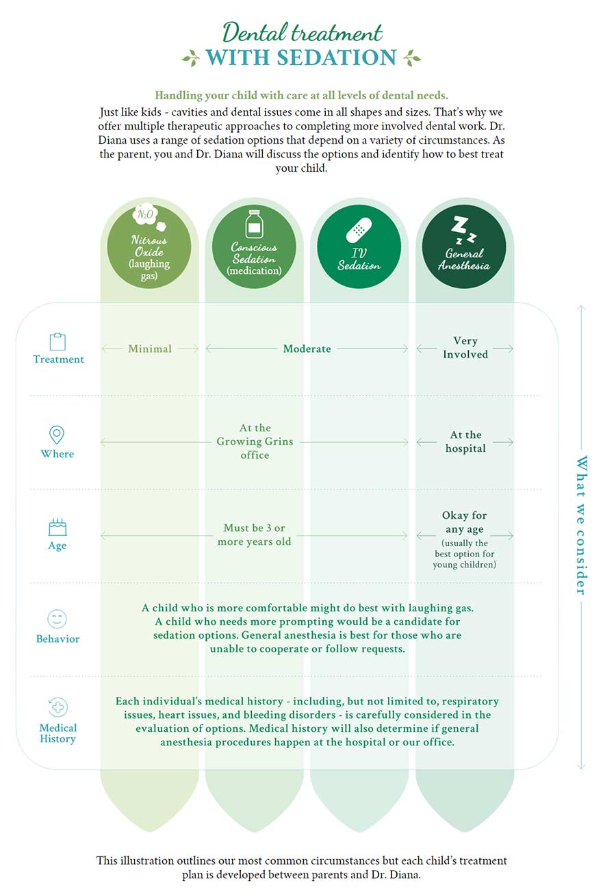Custom infographicWith a main focus of the website to inform and educate parents about what to expect for pediatric dental care at Growing Grins, the sedation illustration infographic was an important page for our design team.