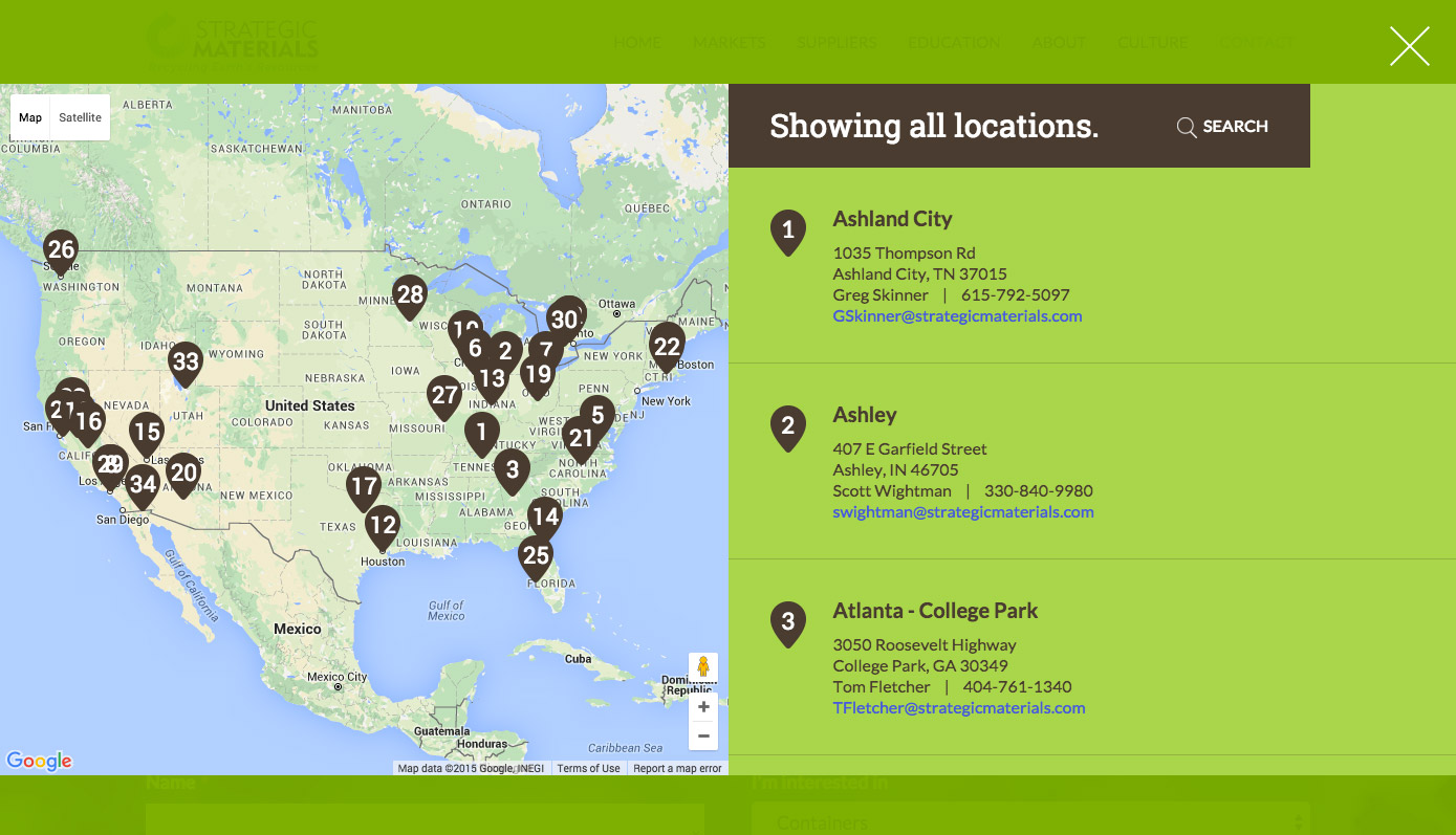 • Custom website tools: With locations across North America, a key goal of the project was to make it easy for customers to locate and find the Strategic Materials location nearest them. Our customized location tool matches the modern styling of the site and is very easy for the user to find the nearest location and person to contact.