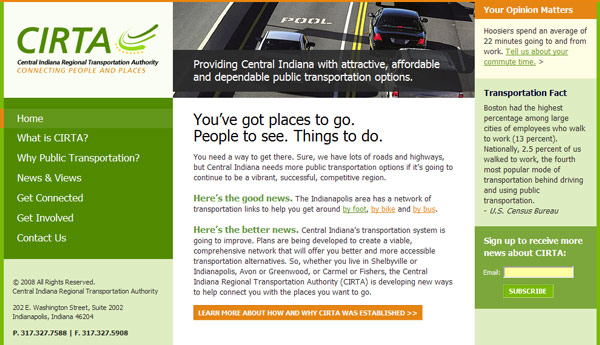 CIRTA has been a long-time client of TBH Creative. We developed their brand and first website in 2007. As they grew and acquired Central Indiana Commuter Services (CICS)–now Commuter Connect–it was time for an upgrade in web design and structure. We designed a new interface for a wider screen and more balance with brand colors and graphic appeal. We also installed our Content Management System with custom modules developed to suit their specific needs.