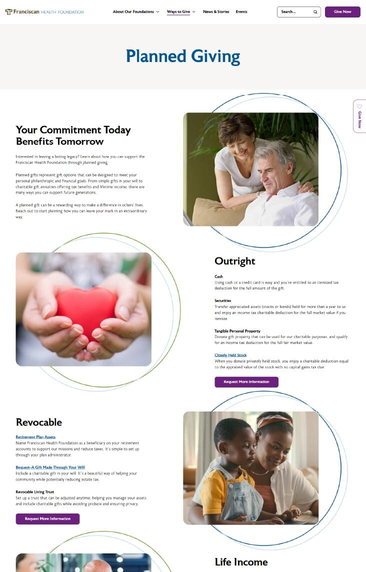 TBH Creative designed a customized donation experience to allow donors to make their giving personal by region or program. Users are able to seamlessly navigate between the programs and regional foundations for dedicated or general giving.
